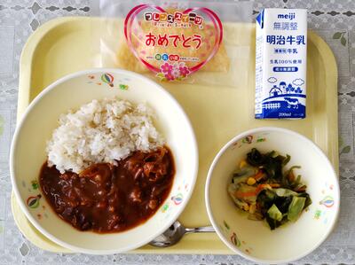 今日の給食は卒業お祝いメニューです