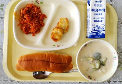 今年度、最初の給食メニューを紹介します。セルフドックパン(牛乳パン、ウインナー、ケチャップ&マスタード)、牛乳、ブロッコリーとしめじのサラダ、ミネストローネです。久しぶりの給食でしたが、多くの栄養素をバランスよく摂取できる給食に改めて感謝の気持ちを表したいと思います。生産者の皆様、給食センターの皆様、ありがとうございます。今日も美味しくいただきました。ごちそうさまでした。