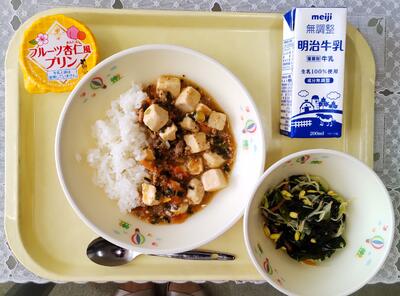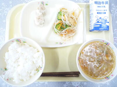 本日のメニューは、「ご飯」、「牛乳」、「エビシュウマイ」、「中華クラゲあえ」、「タンタン春雨スープ」です。今日も美味しくいただきました。ごちそうさまでした。