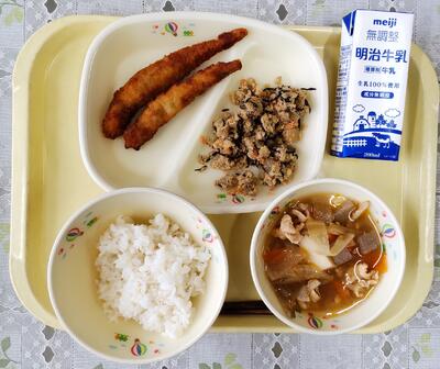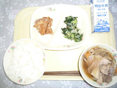 本日のメニューは、ご飯、牛乳、鶏肉のから揚げ、ジャことエビのサラダ、のっぺい汁です。「のっぺい汁」は、日本全国で食べられている郷土料理の一つで、鶏肉や野菜などを煮て、でんぷんでとろみをつけた汁のことだそうです。写真右下のお椀が、「のっぺい汁」です。今日も美味しくいただきました。ごちそうさまでした。