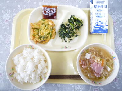 今日のメニューは、「セルフかき揚げ丼(ごはん、野菜かき揚げ、天丼のたれ)」、「牛乳」、「菜の花あえ」、「かんぴょう入りかきたま汁」です。明日は、入学式です。天気が少し心配ですが、17名の新入生が元気に登校してくれるのを楽しみにしています。午後、準備がありますが、その様子は後ほどお知らせします。今日も美味しくいただきました。ごちそうさまでした。