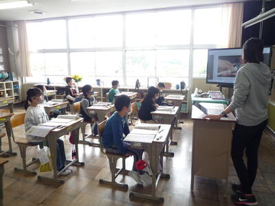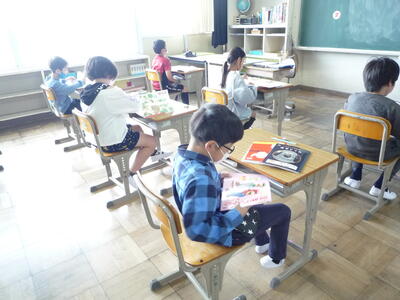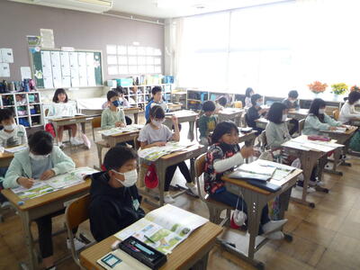 ゴールデンウィークがスタートしました。月、火が休みで「9連休」というパターンもあるようです。2時間目の授業の様子を紹介します。1年生は、算数です。数の仕組みをブロックを操作しながら学習しています。2年生は、国語です。新出漢字をしっかと覚えようとがんばっています。3年生は、外国語活動です。ペア学習で協力しながら外国語に親しんでいます。4年生は、算数です。棒グラフの特徴や活用方法について学習しています。5年生は、算数です。直方体や立方体について調べたり、考えたりしています。6年生は、家庭科です。朝食の役割について改めて確認しています。