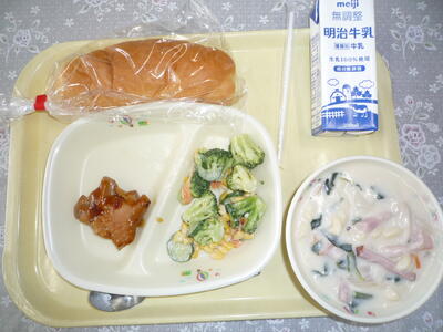 今日のメニューを紹介します。牛乳パン、牛乳、照り焼きチキン、コーンとブロッコリーのサラダ、マカロニのクリーム煮です。今日も美味しくいただきました。ごちそうさまでした。
