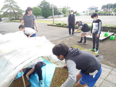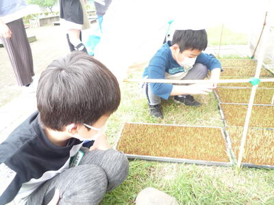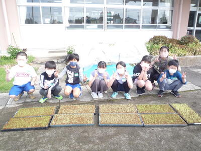 本校では、5年生の総合的な学習の時間「お米を作ろう」で、米作りに取り組んでいます。今日は、毎年お世話になっている赤羽啓一様に御指導いただきました。苗床を作り、芽出しした種籾をまく作業です。田植えと稲刈りを体験する学校はありますが、こうして種籾の状態から米作りを始める学校はあまりなく、それが本校の特色にもなっています。今年も美味しい「ゆうだい21」が収穫できるように願っています。