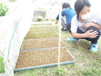 4月25日に5年生が「ゆうだい21」の種籾をまいたことをお知らせしましたが、あれから1週間、その苗が順調に成長しています。これまで、室内で管理していましたが、今日から屋外で育てます。明日、田植えまでの水の管理をするため、ビオトープに移動する予定です。今後も5年生の活動と稲の成長を随時、お知らせします。