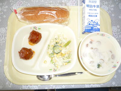 5月最初の給食は、牛乳パン、牛乳、肉団子トマトソース、コーンサラダ、白いんげん豆のポタージュでした。今日も美味しくいただきました。ごちそうさまでした。