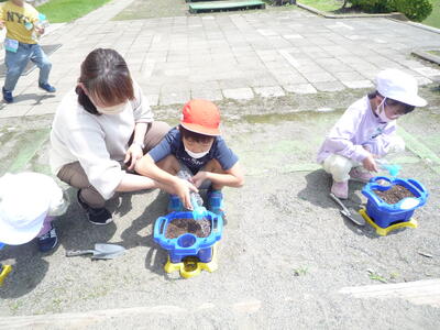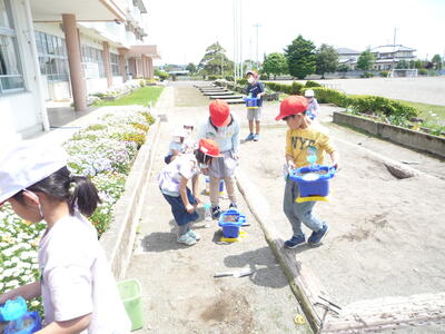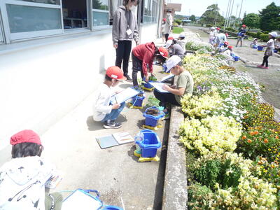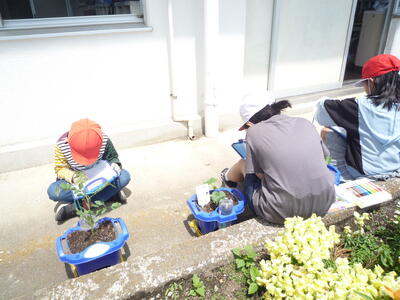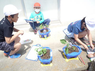 さわやかな晴天です。1年生と2年生の生活科の様子です。1年生は、アサガオの種をまきました。「元気に芽を出してね。」と気持ちをこめて、お水もたっぷりあげています。2年生は、野菜の苗の観察です。一人一人がキュウリやピーマン、ナスなど自分で選んだ野菜を育てています。アサガオも野菜も成長が楽しみですね。