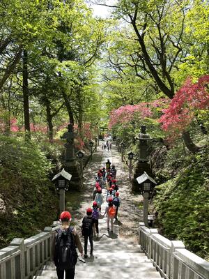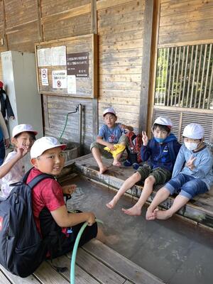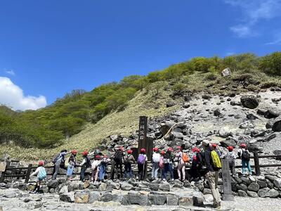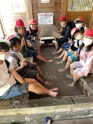 自然の家に向かう途中、殺生石と温泉神社を見学しました。上高小から見える空よりも、那須の空はその青さが際立っているような気がします。足湯に浸かっていい気分!なんともうらやましい限りです。この後も、那須の自然を満喫してください。