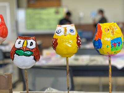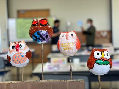 自然の家に到着後、入所式を行いました。自然の家の先生から食事や入浴、ベッドメーキングなど、生活の仕方について話を聞きました。そして、お待ちかねの昼食です。午後は、「フクロウの絵付け」の活動です。一人一人、色の組み合わせを工夫して個性のある「フクロウ」さんが出来上がりました。明日、持ち帰りますのでお楽しみに!この後は、お風呂に入って、それから夕食です。今日の疲れを取るためにゆっくり寝られるといいですね。ワクワクドキドキでちょっと寝不足も心配ですが・・・
