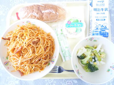 本日のメニューは、「牛乳パン」、「牛乳」、「スパゲッティナポリタン」、「花野菜サラダ」、「シークワーサーゼリー」です。今日も美味しくいただきました。ごちそうさまでした。
