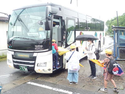 昨日の雨が嘘のように朝から晴天で、気温も上がっています。今日と明日、3,4年生の宿泊学習が実施されます。3年生にとっては初めての学校行事でのお泊り。いろいろと不安もあるでしょうが、昨年経験した頼もしい4年生がサポートしてくれます。盛大な見送りを受け、元気に出発しました。2日間、楽しい思い出をたくさん作ってください。