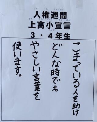人権擁護員の皆様による「人権教室」、誰もが認められるクラスを目指した「上高小宣言」の作成、友達にされて嬉しかったことに感謝する「みんなのすてき」の作成、給食時の校内放送での「友達のよいところ発見!タイム」の発表、人権意識の高揚につながる本の読み聞かせ、人権に関する題材を取り上げた道徳授業等、様々な活動を実施し、人権意識の高揚を図っていきます。