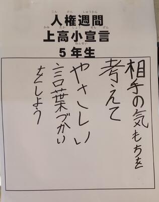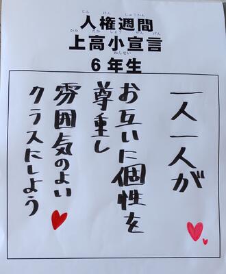 教室の入口には、クラスで考えたいじめ防止標語「上高小宣言」が掲示されました。人権週間中、朝の会でクラスの標語を確認し、帰りの会で振り返ります。