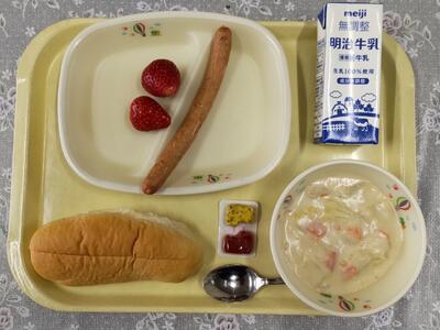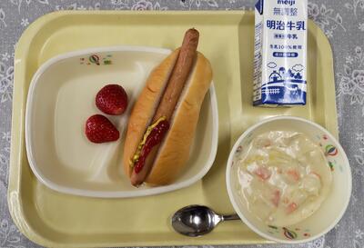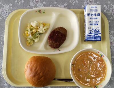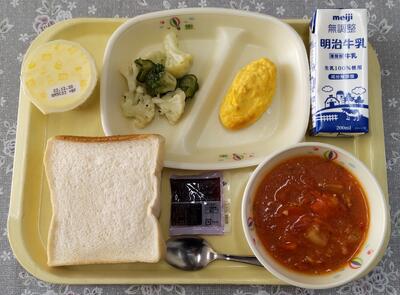 今日は、阿久津中学校1年3組の皆さんが家庭科の授業で考えてくださった献立です。「米粉パンやミネストローネスープなど、みんなが好きなメニューを取り入れ、栄養バランスやいろどりをよくできるように考えました。」というコメントをいただいています。