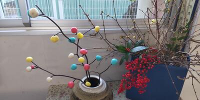 生活科の時間に、1年生が、シニアクラブの6名の皆様と一緒にまゆ玉作りを行いました。まゆ玉飾りは、作物の豊かな「実り」を表現したもので、今年の豊作を願って作るものだそうです。子どもたちは自分たちで作ったまゆ玉をミズの木に上手に飾り付けていました。エゴノキは、シニアクラブからいただいたも物を使わせていただきました。お忙しい中、子どもたちのために御協力をいただき、ありがとうございました。