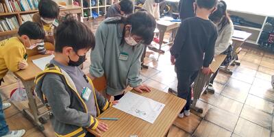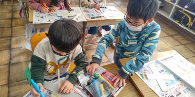 3年生は「図工」の授業です。動きのある下絵ができあがりました。どんな気持ちの動きなのか友達に説明しています。