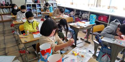 2年生は、「図工」の授業です。カッターナイフの使い方について学習しています。難しいですね。