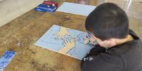 4年生は「図工」の授業です。木版画に取り組んでいます。彫刻刀を上手に使いこなしています。