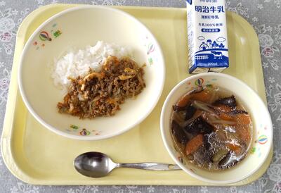 今日のけんちん汁は町内産のきのこを使った「きのこけんちん汁」です。まいたけのだしとなめこのぬめりがけんちん汁をおいしくしてくれています。給食で使ってくださっている「なめこ」や「まいたけ」「しいたけ」「きくらげ」は年間を通して町内産を使用し、使用率100%だそうです。安心していただけますね。
