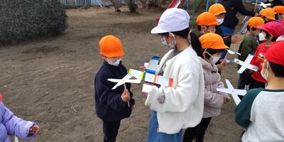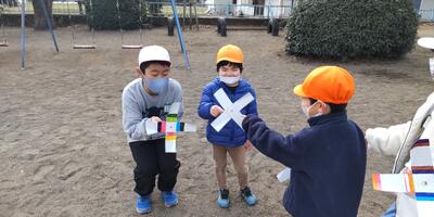 本日は、のびのび保育園の年長児の皆さんをお迎えして、交流会を行いました。「はじめまして」の会では、1年生から保育園の皆さんにアサガオの種をプレゼントしました。その後、1年生が手作りした風車を一緒にまわしました。上手に風に乗せまわすことができ、皆大喜びです。一緒に記念写真を撮ったり、遊具で遊んだりすることができ、楽しいひと時を過ごすことができました。