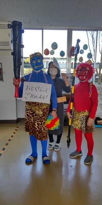 大変遅くなりましたが、本日はこどもたちからのリクエストに応えて、青鬼さん、赤鬼さんがやってきました。今年は福の神さんが、豆をまきました。季節の変わり目には邪気(人に害を与えようとする心)が生じるという考えから、鬼払いなどの儀式(豆まきなど)が行われるようになったそうです。