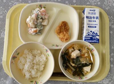 本日の給食は「カミカミメニュー」です。きびなごフライのきびなごは、ニシンやイワシの仲間で、体に銀色の線がある10㎝位の小さな魚です。今日は粒状のじゃが芋を衣にし、油で揚げてくださいました。丸ごと食べることができるので、よくかんで残さず食べてください。