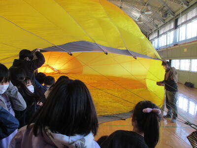 最後に、本物の気球の一部を膨らませていただきました。内部に入った子どもたちは、その大きさに驚いていました。貴重な体験をさせていただきまして、ありがとうございました。