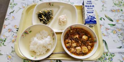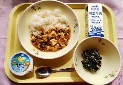 今日の給食は、マーボー豆腐です。寒い季節にはぴったりですね。ナムルにはたくさんのニラが入っています。香りがもち味のスタミナ野菜です。たくさんいただきたいですね。