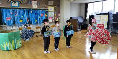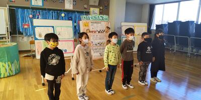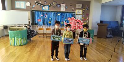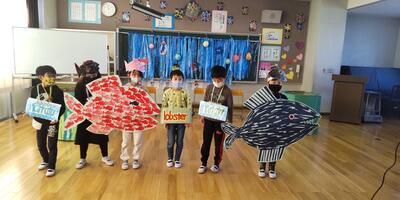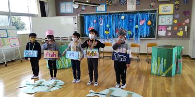 1年生が、生活科発表会を行いました。国語、算数、図工、外国語、体育の5つのグループに分かれての発表です。どのグループも自分たちができるようになったことを様々な工夫をしながら、発表することができました。