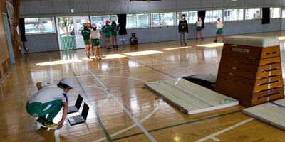気球について説明をしていただいた後、グループに分かれ、ミニ気球を作りました。出来上がった気球をバーナーで暖めると、あっという間に体育館の天井に上がっていきました。