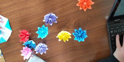 5年生は、「算数」です。折紙を使って、何か形をつくろうとしています。この後の授業にどういかしていくのでしょうか。