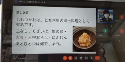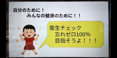 給食センターの方々が、毎朝6時30分から給食の準備をしてくださっていることや栃木県の特産物についてなどの給食に関するクイズがありました。最後に、毎日実施している衛生チェックについてのお知らせがありました。