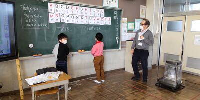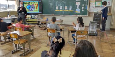 清水先生、中村先生、チトコ先生の「ALL ENGLISH(すべて英語)」での質問に正確に、そして自信をもって答えている5年生のこどもたちです。