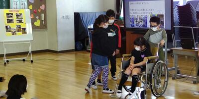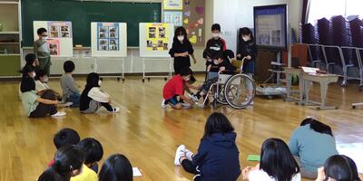 4年生が、総合的な学習の発表会を行いました。車椅子体験、トラストウオーク体験、高齢者疑似体験、社会福祉施設についての4グループに分かれて発表を行いました。