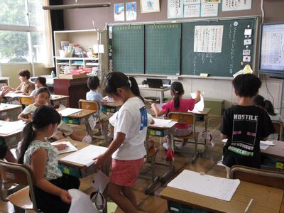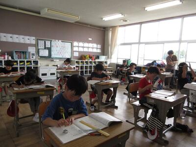 1時間目と2時間目は、漢字・計算力テストでした。漢字・計算力テストは、例年家庭学習強調週間の後と夏休み明けの頃に日付を設定して行っています。本日が今年度第1回目で、今後あと3回、8月28日、11月25日、2月7日に予定してます。(1年生は次回から実施します。今日はドリルで足し算の計算をしていました。)