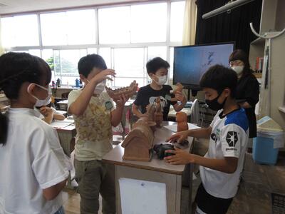 6年生がいろどりいためを作っているころ、1年生もおいしいものを作っていました。粘土で作ったごちそうを、お皿にのせて仕上げます。