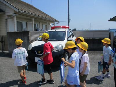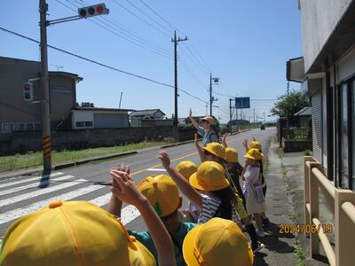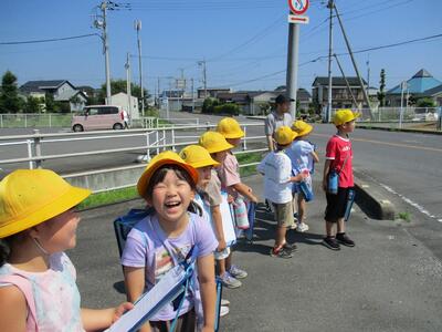 道路に安全を守るための標識や横断歩道、信号機があること、学校の近くにみんなで使う公共施設があることなどを、探検しながら見つけてきました。また、途中で「のびのび保育園」にもおじゃまして、園児のみなさんと交流活動をしてきました。