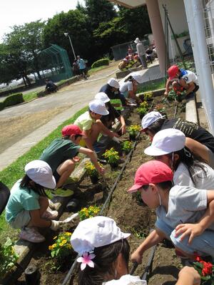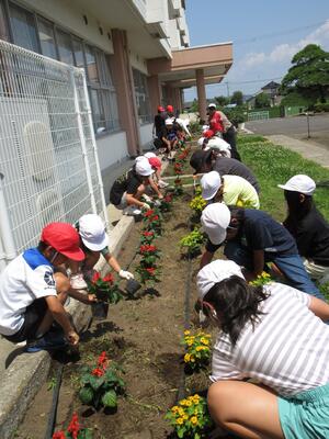 校舎の南側にある花だんは、ふれあい班(縦割り班)ごとに分担が決まっています。