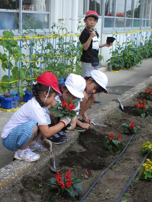 今日はふれあい班で、各分担の花だんに花苗を植えました。サルビアとメランポジウムです。
