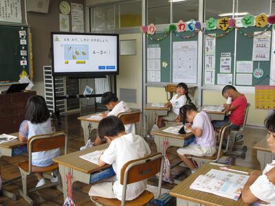 「駐車場に車が4台ありました。そのうち3台が出て行きました。残りは・・・1台。これを式にすると・・・」と、ていねいに確認しながら、引き算の式について理解を深めました。
