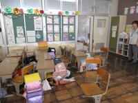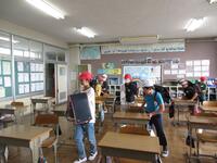 今回は、児童が教室内にいる状況で、学校の南側から竜巻が接近してくる場合を想定しての避難訓練でした。窓とカーテンを閉め、窓から離れて帽子とランドセルで頭部を守り、机の下に入りました。