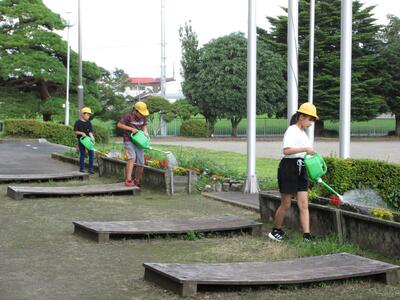 一年生が1時間目に自分のアサガオの水やりをしていました。花が咲き始めていて、「今日は2個咲いたよ」「これはもう終わった花かな」「葉っぱにカエルがのっているよ」「早く(自分のアサガオも)咲かないかな」等々、情報交換をしながら、植木鉢にたっぷりと水をかけました。
