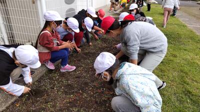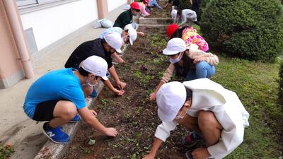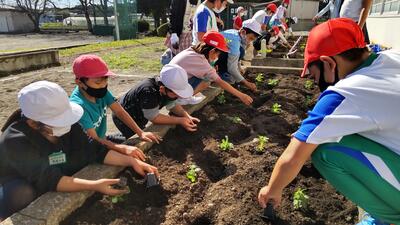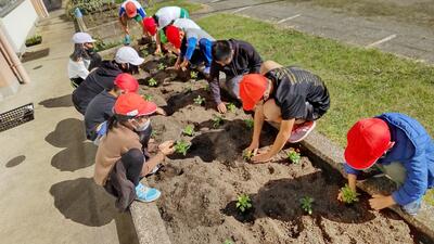 6年生5年生がリーダーとなり下級生に、植え方や植える位置を説明しました。水やりをし、苗の根元までしっかり植えることができたか確認できたでしょうか。