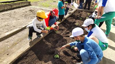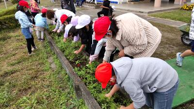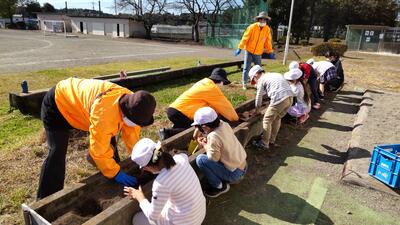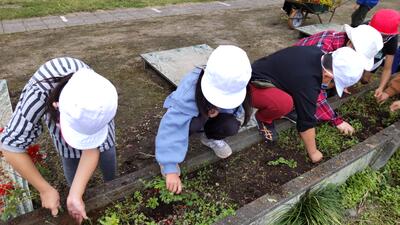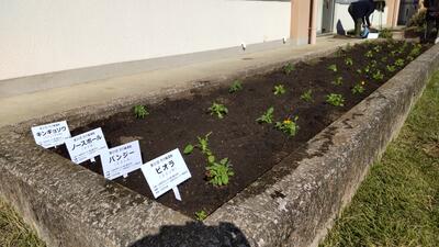 「花の輪運動」でいただいたパンジー、ビオラ、キンギョソウ、ノースポールを、ふれあい班ごとに協力して定植しました。