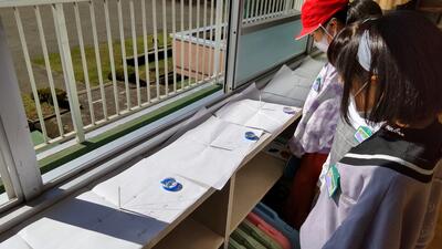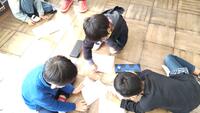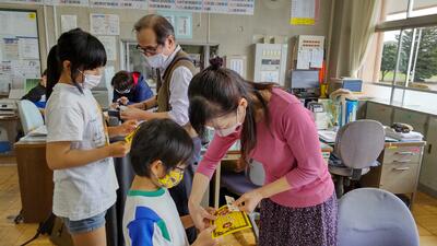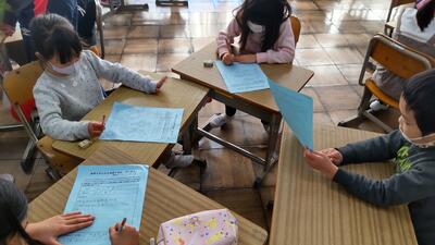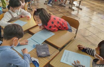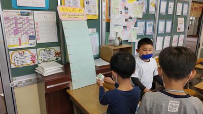 早速、子どもたちは「お願い札」を箱の中に入れました。このお札は、米袋を再利用して作られています。 1年生はお家の方と一緒に願い事を考えるために「お願い札」を持ち帰りました。