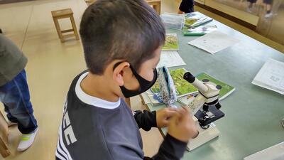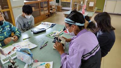 5年生「理科」の授業です。様々な植物の花粉を顕微鏡で観察しています。顕微鏡の正しい使い方はできているでしょうか。