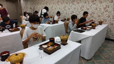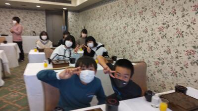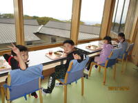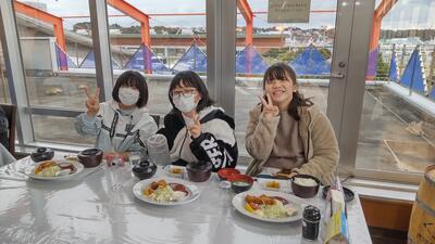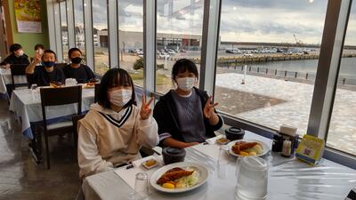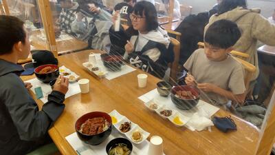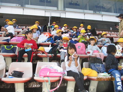 昼食は、レースが行われるグランドスタジアムの観覧席でいただきました。バイクの大きな音に少し驚いていたようです。事前に話し合った活動のきまりを守り、皆で楽しく過ごすことができました。