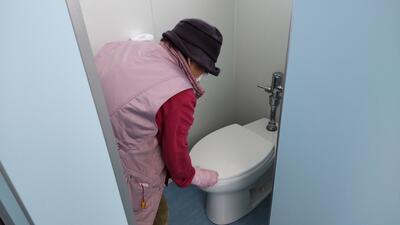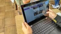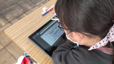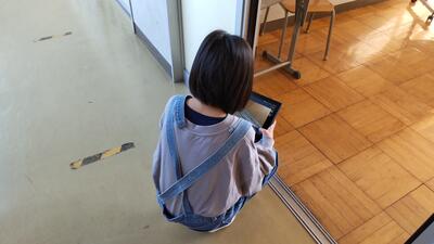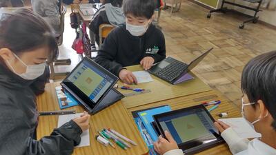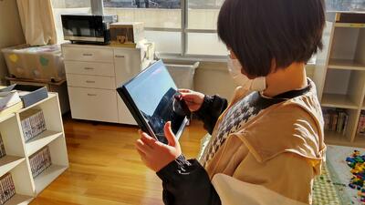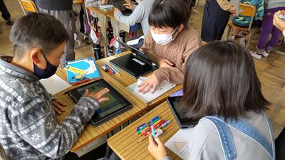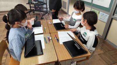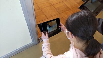 5年「家庭科」の授業です。ごみが集まりやすい場所を、タブレットに記録しているようです。