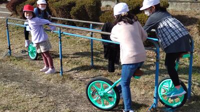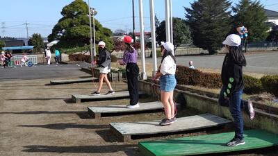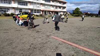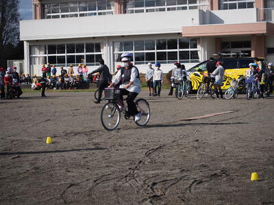 その後、4年生5年生6年生は、校庭に移動して実技を行いました。実技では、校庭に専用コースを設営していただき、決められたコースを自転車を操縦していきました。ヘルメットをしっかりかぶり、細い板の上やカーブなど、慎重に自転車を操縦していきました。