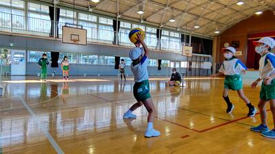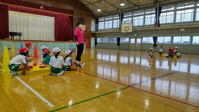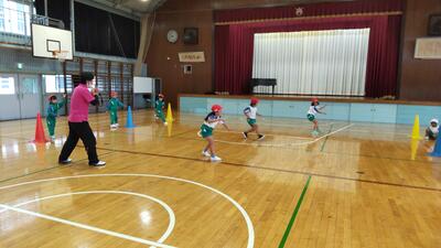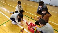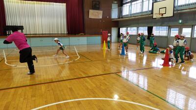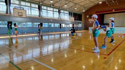 ボールを床にバウンドさせ、チームでラリーを楽しみます。ボールをつなげることで周りの仲間とつながり,一体感を味わうことができます。